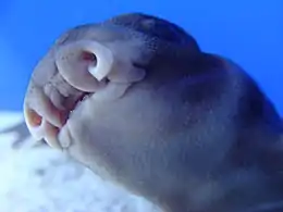 La petite bouche est positionnée presque à l'extrémité du museau. Des sillons profonds aux coins de la bouche s'étendent sur les mâchoires inférieures et supérieures[1]. Les dents de maintien antérieures possèdent une cuspide et une paire de petites protubérances (petites cuspides) chez l'adulte. Les dents postérieures sont molariformes : non crénelées, larges et arrondies. Les denticules latéraux sont gros et durs[2].