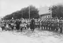 Après l'armistice de , les opposants à Skoropadsky forment un gouvernement rival connu sous le nom de « Directoire », dont les forces accueillent les fusiliers de la Sitch ; les « Capotes grises » rejoignent également la révolte. Bien que les troupes allemandes et autrichiennes soient toujours présentes en Ukraine, elles n'ont aucun intérêt à se mêler à cette guerre. La plupart des forces de Skoropadsky se rallient elles-mêmes au Directoire, et il doit se tourner vers les milliers d'officiers blancs qui se sont échappés en Ukraine afin de rejoindre l'Armée des Volontaires de Dénikine, qui est basée dans la région du Don vers l'est. Ils sont rassemblés dans un « corps spécial » d'officiers russes blancs ; Dénikine est disposé à les laisser combattre pour Skoropadsky car il affaiblit les nationalistes ukrainiens, mais ils ne peuvent résister aux troupes du Directoire. Celles-ci s'emparent de Kiev en , renversant le régime de Skoropadsky, qui est contraint à l'exil.