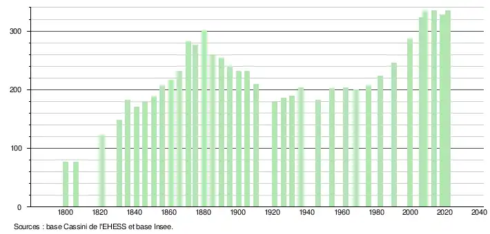 L'évolution du nombre d'habitants est connue à travers les recensements de la population effectués dans la commune depuis 1800. Pour les communes de moins de 10 000 habitants, une enquête de recensement portant sur toute la population est réalisée tous les cinq ans, les populations légales des années intermédiaires étant quant à elles estimées par interpolation ou extrapolation[16]. Pour la commune, le premier recensement exhaustif entrant dans le cadre du nouveau dispositif a été réalisé en 2008[17].