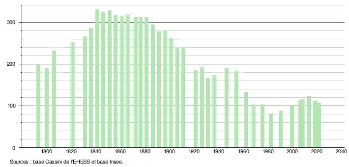 L'évolution du nombre d'habitants est connue à travers les recensements de la population effectués dans la commune depuis 1793. Pour les communes de moins de 10 000 habitants, une enquête de recensement portant sur toute la population est réalisée tous les cinq ans, les populations légales des années intermédiaires étant quant à elles estimées par interpolation ou extrapolation[29]. Pour la commune, le premier recensement exhaustif entrant dans le cadre du nouveau dispositif a été réalisé en 2008[30].
