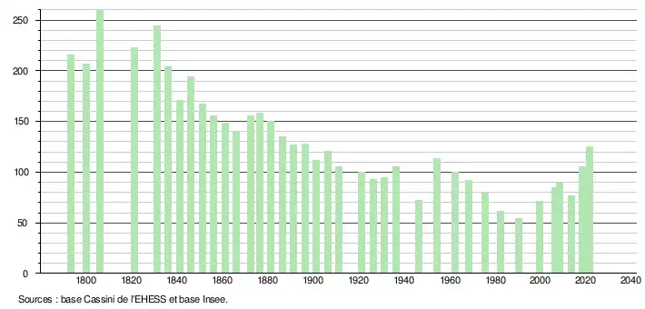 - Population municipale légale en vigueur au 1er janvier 2024, millésimée 2021, définie dans les limites territoriales en vigueur au 1er janvier 2023, date de référence statistique : 1er janvier 2021.