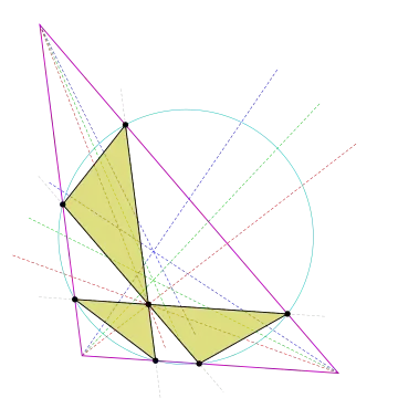 Pour l'hexagone simple dessiné à partir d'un triangle de côtés et d'aire le périmètre est donné par