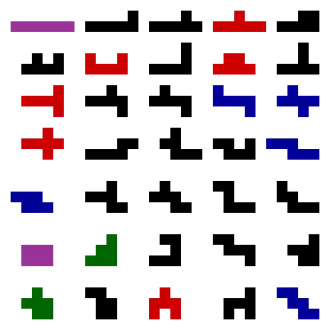 - 2 hexaminos, en pourpre, possèdent deux axes de symétrie, alignés selon les lignes de la grille. Leur groupe de symétrie possède quatre éléments.