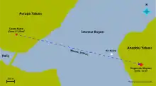 Trajectoire, distance et altitudes de la Tour de Galata en Europe jusqu'à Üsküdar sur la rive asiatique du Bosphore.