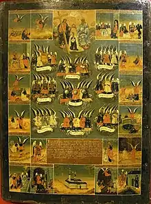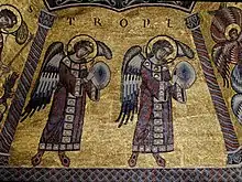 Les Archanges sont les messagers extraordinaires de Dieu auprès des hommes. Saint Thomas d'Aquin place trois archanges ici : saint Michel, saint Gabriel et saint Raphaël. Cette tradition est reprise par le Magistère de l'Église Catholique Romaine. Le mot Archange (ἀρχάγγελος, arkhággelos) signifie en grec « dirigeant des anges », αρχι- (archí-) étant un préfixe désignant celui qui dirige. Ceux qui annoncent des nouvelles ordinaires sont des anges, mais ceux qui annoncent de grands événements sont des archanges. Ce sont eux qui dirigent les anges et leurs assignent leurs tâches quotidiennes[14]. Les Archanges ont le costume militaire, tunique et manteau, glaive, lance et bouclier ; les Grecs y ajoutent le sceau de Dieu. À Milan, le phylactère dénote qu'ils sont des messagers célestes et parlent au nom de Dieu[16].