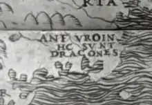 Une autre expression consacrée, utilisée par les cartographes romains et médiévaux pour annoter les zones inconnues de leurs cartes, était hic sunt leones (« ici sont des lions »).