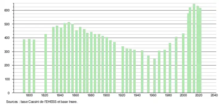 L'évolution du nombre d'habitants est connue à travers les recensements de la population effectués dans la commune depuis 1793. Pour les communes de moins de 10 000 habitants, une enquête de recensement portant sur toute la population est réalisée tous les cinq ans, les populations légales des années intermédiaires étant quant à elles estimées par interpolation ou extrapolation[18]. Pour la commune, le premier recensement exhaustif entrant dans le cadre du nouveau dispositif a été réalisé en 2008[19].
