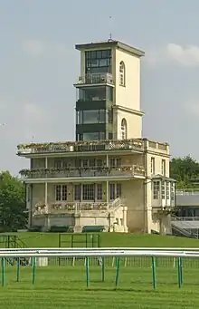 Afin de remplacer les premières tribunes provisoires construites en 1835, le duc d'Aumale, propriétaire du terrain, fait édifier deux nouvelles tribunes de style anglo-normand en 1847 par son architecte Jean-Louis Victor Grisart. Celles-ci sont reconstruites par Honoré Daumet, architecte du château de Chantilly en 1881. Le bâtiment de pesage est pour sa part construit en 1891 par Charles Girault, élève de Daumet. La tribune du comité, ancienne tribune du prince, est reconstruite en 1911 par l'architecte Saint-Ange. L'ensemble est inscrit Monument historique[3].