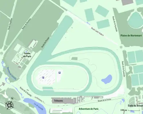 S'étendant sur 42 hectares, l'hippodrome comprend une piste cendrée de 1 975 m (avec une montée et une descente) et une seconde de 1 325 m, réservée aux courses nocturnes.