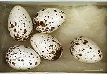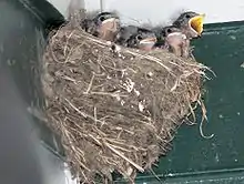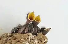La femelle pond entre deux et sept, mais généralement quatre ou cinq, œufs blancs à petits points roux et gris. Les œufs mesurent entre 20 et 14 mm, pour un poids de 1,9 g, dont 5 % de coquille. En Europe, la femelle effectue presque toute la couvaison, mais en Amérique du Nord le mâle peut couver pendant 25 % du temps. L'incubation dure entre 14 et 19 jours, au cours desquels la femelle maintient constante la température des œufs, en évitant qu'ils se refroidissent mais également parfois qu'ils se réchauffent, lorsque le nid est placé sous des tôles très exposées par exemple. Des femelles ont ainsi été observées s'humidifiant le ventre pour rafraîchir leurs œufs[27]. Après l'éclosion, il faut encore 18 à 23 jours pour que les oisillons quittent le nid. Pendant ce temps, ils sont nourris par leurs parents qui leur apportent régulièrement des insectes, qu'ils agglutinent dans leur bec quand ils chassent. Ils peuvent apporter ainsi une vingtaine d'insectes à la fois, et répètent leurs allées et venues jusqu'à 400 fois par jour. Les jeunes hirondelles atteignent leur poids maximum vers le treizième jour, et pèsent alors environ 22 g. Ce poids se réduira un peu par la suite lorsqu'elles formeront leurs plumes[5]. À partir du quinzième jour, les oisillons n'ont plus besoin de leurs parents pour maintenir leur température constante, et ceux-ci ne les abritent plus que pendant la nuit. Après 18 à 23 jours passés au nid les oisillons vont pouvoir le quitter. Pour les y inciter, leurs parents cessent de les nourrir, puis leur tendent des insectes et lorsque les jeunes se sont suffisamment approchés du bord, lancent des cris d'alerte qui les font chavirer dans le vide. Là, battant leurs ailes par réflexe, les jeunes prennent alors leur premier envol[5]. Les jeunes hirondelles qui commencent à quitter le nid vivent avec leurs parents, qui continuent à les nourrir pendant environ une semaine. Occasionnellement, les jeunes de la première couvée aident à nourrir ceux de la seconde[6]. Au bout de 35 jours, les jeunes sont totalement indépendants.
