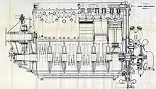 - Distribution : une soupape d'admission et une soupape d'échappement par cylindre, soupapes en ligne actionnées directement par un arbre à cames en tête unique dans chaque banc de cylindre, via un plateau cranté pour le réglage des jeux.