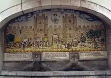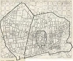 La création de ces nouveaux quartiers va rendre nécessaire le développement d’un nouveau mur d’enceinte longues de 5 100 m et englobant une superficie de 1,5 km2 de Saint-Pierre de les Puelles jusqu’aux Drassanes sur la mer Méditerranée[37]. Ces nouvelles murailles disposent de quatre-vingts tours ainsi que de huit portes. À cela s’ajoute la construction dans la périphérie directe de la ville d’une série de fortification pour la défense du territoire à l’instar du château du port à Montjuïc, du château de Martorelln, de celui de Castellví de Rosanes le long du Llobregat, de celui d’Eramprunyà à Gavà, de celui de Castelldefels sur la côte ou encore celui de Montcada[38]. À cette époque, Barcelone a une population d’environ 25 000 habitants[39].