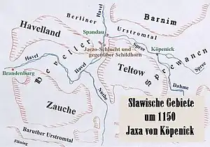 En 1157, le prince allemand Albrecht l’Ours inflige au prince slave Jaxa de Copnic, alors au sommet de sa force, une défaite décisive[3], qui permet la fondation de la marche de Brandebourg. Celle-ci inaugure l'assimilation (germanisation et christianisation) des Slaves (à l'exception des Sorabes, christianisés plus tard, et qui ont gardé leur langue slave jusqu'à nos jours). La construction des premiers quartiers de Berlin coïncide avec la fondation du margraviat de la maison d'Ascanie à Teltow, et elle est marquée par une politique de colonisation habile (avec intégration de l'aristocratie slave antérieure) et une collaboration active avec les moines cisterciens du monastère de Lehnin[4]. Le quartier du Zehlendorf, au sud de Berlin, et au-delà le village slave de Slatdorp sur le lac de Slatsee (auj. Schlachtensee (de)) ressortissaient du domaine ecclésiastique de Lehnin.