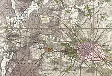 Entre le plateau de Teltow méridional et le plateau de Barnim septentrional, les berges asséchées d'un gué de la vallée proglaciaire marécageuse sont d'abord colonisées. Parmi les faubourgs qui deviendront plus tard des quartiers de Berlin, quelques uns sont mentionnés dès le XIIe siècle : Spandau en 1197, Köpenick en 1209, Cölln en 1237 et Berlin en 1244[5]. Tempelhof désigne une commanderie de Templiers. Cölln est une île de la Spree, tandis que Berlin s'étend sur la rive droite. Spandau et Köpenick sont des villages slaves préexistants à la conquête. Spandau obtient une charte communale en 1232, et Berlin très probablement à la même date. Berlin et Cölln fusionnent en 1307. Grâce au privilège accordé par le gouvernement bicéphale des margraves Othon III de Brandebourg et Jean Ier de Brandebourg, la ville unifiée Berlin-Cölln peut alors s'imposer économiquement aux villes conquises de Spandau et Köpenick.