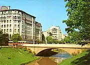 Pendant les premières années du règne de Carol, la Banque nationale de Roumanie a été ouverte en , en tant que première et plus importante de la série de nouvelles institutions bancaires. Après l'érection de la principauté en royaume de Roumanie en 1881, les travaux de construction se sont accélérés dans la capitale. En 1883, les inondations de la Dâmbovița ont été stoppées en ville par la canalisation de la rivière (le changement du cours de la rivière modifia le voisinage proche des banques)[69]. De nouveaux bâtiments sont ajoutés, notamment l'Athénée roumain, et les immeubles augmentent leur taille : l'« Athénée Palace » et une tour de veille des pompiers en pierre (« Foișorul de Foc », qui remplace les anciens miradors en bois) sont les premiers bâtiments de la ville à utiliser du béton armé[70]. En 1885-1887, après la dénonciation par la Roumanie de ses liens économiques exclusifs avec l'Autriche-Hongrie, le développement commercial et industriel s'est développé sans entrave : plus de 760 nouvelles entreprises se sont établies dans la ville avant 1912, des centaines de plus pendant les années suivantes[71]. L'utilisation de l'électricité, de manière limitée, a été mise en place en 1882.