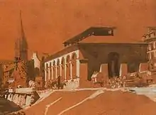 De nouveaux équipements publics émaillent la ville[94]. Le palais des facultés (ou grandes écoles), dont les travaux ont débuté en 1694, est achevé en 1704[4],[95]. Afin d'accueillir les échevins lors de la foire, la municipalité se fait construire un pavillon, l'actuel pavillon des sociétés savantes. La ville dispose d'un vauxhall et, à partir de 1765, d'un théâtre, la Comédie. Alors que le château devient de plus en plus obsolète, des casernes sont construites : pavillon Saint-Sauveur sur la place Fontette et surtout caserne de Vaucelles sur l'ancienne île de la Porte Millet. En 1758, on décide de réunir dans un même bâtiment le bailliage et le bureau des finances de la généralité de Caen, mais ce n'est qu'en 1779 que les plans dressés par Armand Lefebvre, ingénieur des ponts et chaussées de la généralité de Caen, pour le palais de justice de Caen sont acceptés[96].