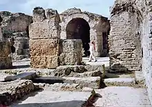 Après une escale à Chypre, Élyssa s'installe sur les côtes d'Afrique, dans l'actuelle Tunisie, avec d'autres Tyréens, dont certains sont des notables ayant abandonné la ville, et des vierges de Chypre enlevées alors qu'elles devaient s'adonner à la prostitution sacrée[22]. C'est donc un contingent hétéroclite qui serait à l'origine de l'une des plus grandes cités de l'Antiquité. La tradition la plus couramment admise date la fondation de la ville en 814 av. J.-C. Selon les traditions les plus répandues, le roi du pays, Hiarbas ou Iarbas, consentit à leur offrir un territoire « aussi grand que pourrait en recouvrir une peau de bœuf ». Élyssa, en ayant recours à une ruse punique (punica fides) découpa alors la peau en lanières dont elle entoura un territoire suffisant pour y bâtir une citadelle, les arrivants payant un tribut au roitelet local[25]. Ce territoire, appelé Byrsa (« bœuf »), deviendra le centre historique de la cité punique.