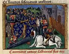 Le , Thomas Kyriell débarque à Cherbourg à la tête de 3 000 soldats pour reprendre le Cotentin et le Bessin[23]. Dernière possession anglaise en Normandie à la suite de la bataille de Formigny, la forteresse est une fois de plus assiégée. Les troupes françaises parviennent à tromper les Anglais en attaquant la forteresse par la grève, à l’aide de batteries sur pilotis, la poudre et les canons enveloppés dans des peaux enduites de suifs pour les rendre imperméables[1]. Le , les remparts cèdent sous les attaques, et Jacques Cœur négocie la reddition qui intervient deux jours plus tard, par le versement de 2 000 écus à la garnison, et la libération du fils de Thomas Gower, commandant anglais du château. Jean V de Bueil, fait amiral de France après la mort lors de ce siège de Prigent de Coëtivy, reçoit le gouvernement de la place. Il répare les murailles et complète le système défensifs par une tour à trois batteries du côté de l'embouchure de la Divette, la tour dite « des Sarrasins »[Note 2]. En raison des souffrances de la population cherbourgeoise, et contre le dépeuplement de la place forte, Louis XI exempte les habitants d'impôts en 1464, règle conservée jusqu'au règne de Louis XV[24]. La Royauté fait du , chute de la dernière possession anglaise sur le territoire français qu'était Cherbourg, une fête nationale[25].