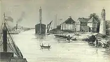 Pourtant, les contraintes naturelles du site posèrent rapidement des problèmes d'aménagement. Chicago souffrait d'un environnement marécageux qui rendait très difficile l'installation de routes et d'égouts. La boue envahissait les rues de la ville au printemps et l'image de Chicago fut celle d'un endroit crasseux. Pour remédier à la situation, les autorités engagèrent d'importants travaux afin de surélever les infrastructures et d'implanter un réseau d'évacuation des eaux usées dans les années 1850. Avec la peur d'une épidémie de choléra et de typhoïde générée par la forte montée des eaux en 1885[29], les autorités municipales décidèrent de détourner la rivière pour préserver l'eau potable du lac, en creusant un canal sanitaire et fluvial (Chicago Sanitary and Ship Canal) qui s'ouvrit sur le Mississippi. Ainsi, la rivière Chicago ne se déversait plus dans le lac Michigan, mais vers le golfe du Mexique.