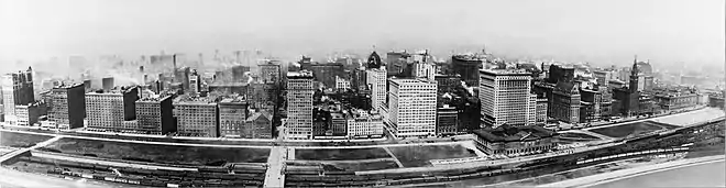 Comptant des dizaines de grandes banques à la fin du XIXe siècle et au début du XXe siècle, Chicago se place juste derrière New York en tant que place financière nationale[74]. Cependant, le commerce de gros et de détail local est tombé de plus en plus sous le contrôle d'intérêts extérieurs à la ville, qui ont racheté ou évincé les grands magasins et les détaillants dans plusieurs gammes de produits[74].