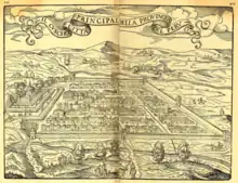 La première description occidentale de Cuzco est rédigée par Pedro Sánchez de la Hoz, secrétaire officiel du conquistador Francisco Pizarro. Le rapport de Sánchez survécut ; publié en 1556 à Venise par l'entremise de Giovanni Battista Ramusio, il comprend une longue description de l’architecture et du plan de Cuzco[28]. C'est le premier texte substantiel sur l'architecture et le plan de la ville inca, écrit par un participant à la conquête du Pérou, et qui y passa un temps considérable. Il fournit des détails remarquables sur un lieu dont l'infrastructure reste encore incomplètement connue aujourd'hui. Selon Sánchez, l’une des caractéristiques les plus remarquables de la ville était une place qu'il affirme « faite de forme carrée, et pour la plus grande part plate, et pavée de petites pierres ». Une gravure sur bois (possiblement de Giacomo Gastaldi) accompagnait la description lors de sa première publication à Venise en 1556, et qui alimentera l’imaginaire sur Cuzco pendant au moins deux siècles[28].
