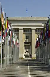 La mission internationale de la ville s'affirme particulièrement après la Première Guerre mondiale : elle devient — notamment par l'action de Gustave Ador et William Rappard — le siège de la Société des Nations en 1919. Cette période est également marquée par l'épidémie de grippe espagnole qui fait 1 155 morts dans le canton de Genève, entre le et le , pour environ 24 392 personnes qui ont été officiellement déclarées atteintes par la maladie, mais ce chiffre peut grimper à 70 000 personnes, avec les cas qui n'ont pas été déclarés, sur une population de 176 000 habitants[77]. Le , les électeurs approuvent en votation la constitution de la commune sous sa forme actuelle avec la fusion des communes de Genève, des Eaux-Vives, de Plainpalais et du Petit-Saconnex. À l'origine de cette fusion, il y a notamment le fait que sa population se déplace dans les communes suburbaines.
