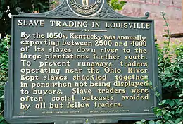 Louisville participait énormément aux commerces des esclaves avant la guerre de Sécession et une partie importante du développement de la ville est d'ailleurs attribué à l'esclavage. De nombreux esclaves furent séparés de leur famille au départ de Louisville avant d'être envoyés dans les régions environnantes. Ils arrivaient en provenance de La Nouvelle-Orléans pour être revendus ensuite aux propriétaires de champs de coton ou dans les plantations de canne à sucre[24],[25]. En 1820, 26 % de la population était composée d'esclaves alors qu'en 1860 elle chuta à moins de 8 % bien qu'ils fussent toujours environ 10 000[26]. La ville était vraiment à la limite entre les régions pro-esclavage et les États anti-esclavage. De nombreux esclaves tentaient de traverser la rivière Ohio pour gagner leur liberté[27].