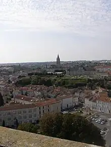 Les travaux d’urbanisme reprennent en 1815 avec l'ouverture du Cours National., ce qui entraîne la construction d'un nouveau Palais de Justice en 1863, en face du théâtre. Cumulée à la suppression de l'évêché de Saintes, causée par la réorganisation des circonscriptions ecclésiastiques qu'impose le Concordat de 1801[59], la perte de la préfecture entraîne une période de déclin relatif. Elle est caractérisée par une démographie plus faible que celle de ses voisines : la ville croît moins vite que Rochefort et La Rochelle, et elle se redresse difficilement après les crises ou les épidémies, si bien qu'elle ne multiplie au cours du XIXe siècle sa population que par deux[60] là où ses rivales suivent une forte croissance démographique.