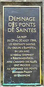 Durant la Seconde Guerre mondiale Saintes est occupée par les Allemands, qui pénètrent dans la ville le 23 juin 1940[68]. Une partie du quartier de la gare est détruit lors du bombardement du 24 juin 1944 : 250 maisons sont touchées et l'on compte 300 morts[69]. La reconstruction de la ville s'étale jusqu'en décembre 1956[68]. Lors de leur retrait de la ville, les Allemands avaient disposé des charges explosives au pont Bernard-Palissy et au pont ferroviaire de Diconche. Une plaque commémorative apposée à l'angle du pont Bernard-Palissy rappelle l'opération de déminage réalisée par deux groupes de résistants dans la nuit du 29 au 30 août 1944.