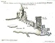 De gueules, à un pont de trois arches, surmonté de trois tours couvertes et girouettées, mouvant du 1er, ayant au 2e un portail, accompagné de deux tours crénelées, couvertes et girouettées, le tout d'argent, sur une onde de même ; au chef cousu d'azur, chargé de trois fleurs de lis d'or.