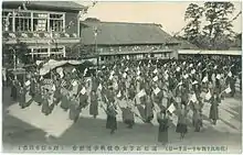 Étudiants de l'Université Keiō pendant un entraînement militaire, rendu obligatoire à partir de 1924 dans l'enseignement secondaire, puis à partir de 1939 dans les universités.