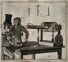 Précédemment observée par ses effets d'attirance des corps légers ou bien de « décharge » par étincelles, l'électricité résineuse ou vitreuse en équilibre dans les corps « chargés » (en analogie avec la charge pondérale et le matériel de levage) aboutit au concept d'« électricité statique ». Avec la production d'une « charge » d'électricité avec des machines « à frottement »[V 1] peuvent commencer les premières expérimentations concrètes. Le premier exemplaire pratique de machine fut celui de Francis Hauksbee avec un globe de verre en 1705.