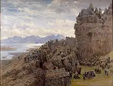 Le roi Ólafur Tryggvason menace alors de massacrer les rebelles à la conversion. Devant ces menaces, deux chefs islandais, Gissur le blanc et Hjalti Skeggjason, déjà convertis, rencontrent le roi et lui promettent que les Islandais seront bientôt évangélisés[C 7]. Le roi accepte et les deux chefs rentrent en Islande pour la session de l'Alþing de l'an 1000. Les Islandais se rassemblent en grand nombre, divisés entre ceux qui veulent garder leurs pratiques et ceux qui désirent se convertir. La plupart souhaite simplement éviter une guerre de religion. Devant l'opposition, les chefs s'accordent pour laisser la décision à Þorgeir Þorkelsson, le goði de Ljósavatn, païen mais modéré. Le jour suivant, Þorgeir annonce que les Islandais doivent devenir chrétiens, sous réserve que certaines traditions soient conservées et que le culte païen puisse s'exercer en privé. Un grand nombre est alors baptisé sur place[12], et la légende veut qu'au retour de Þorgeir Þorkelsson chez lui, il se saisisse de toutes ses statues et les jette au milieu d'une cascade. Depuis, la cascade en question est appelée Goðafoss, cascade des Dieux[13].