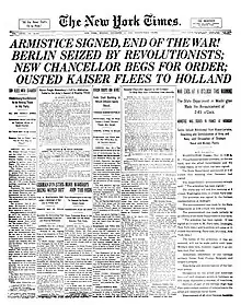 Roy W. Howard fut le premier journaliste à publier la nouvelle de l'Armistice de 1918, quatre jours avant qu'il ne soit annoncé officiellement, s'attirant les foudres de l'administration militaire car le processus pour y parvenir a été long et progressif, sur fond de situation sociale trouble en Allemagne. À partir de septembre, une série d'offensives sur les fronts d'Orient et d'Italie déclenche une première capitulation, les armistices sur les fronts d'Orient. Le , Erich Ludendorff et Paul von Hindenburg décident d'organiser l'armistice en avertissent le kaiser Guillaume II (empereur allemand), par le diplomate Paul von Hintze[9]. Mais il faut attendre le , Matthias Erzberger[10], représentant du gouvernement allemand, passe la ligne de front à Haudroy (commune de La Flamengrie, Aisne), vers la villa Pasques, à La Capelle[11] pour préparer les négociations de l’armistice[12]. Ce n'est que le 10 novembre que le nouveau chef du gouvernement allemand, Friedrich Ebert, signe un pacte avec les dirigeants de son armée et implore son négociateur de clore sans tarder.