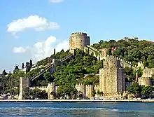 Mehmed II succéda temporairement à son père en 1444 et puis définitivement en 1451. Il est également connu sous le nom de Fatih (le Conquérant) après sa victoire sur les chrétiens et la conquête de Constantinople en 1453, mettant fin aux dernières possessions de l'Empire byzantin. Mehmed était fortement intéressé par les cultures turque, persane et européenne et parrainait des artistes et des écrivains à sa cour. Avant la conquête de 1453, sa capitale est restée à Edirne, où il a achevé un nouveau palais pour lui-même en 1452–53. Il a fait de vastes préparatifs pour le siège, y compris la construction d'une grande forteresse connue sous le nom de Rumeli Hisarı sur la rive ouest du Bosphore, commencée en 1451-52 et achevée peu avant le siège en 1453. Celle-ci était située en face d'une ancienne forteresse sur la rive orientale connue sous le nom d'Anadolu Hisarı, construite par Bayezid I dans les années 1390 pour un siège antérieur, et a été conçue pour couper les communications avec la ville à travers le Bosphore. Rumeli Hisarı reste l'une des fortifications ottomanes médiévales les plus impressionnantes. Il se compose de trois grosses tours rondes reliées par des courtines, au plan irrégulier adapté à la topographie du site. Une petite mosquée a été construite à l'intérieur de l'enceinte fortifiée. Les tours avaient autrefois des toits coniques, mais ceux-ci ont disparu au XIXe siècle.