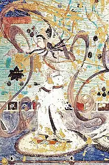 Durant la période des Six Dynasties, entre la fin de la dynastie Han et le début de la dynastie Sui, le développement de la musique et de la danse chinoise subit de fortes influences de l'Asie centrale. Des instruments de musique tels que le pipa en forme de poire et des danses telles que la danse du lion ont peut-être été introduits durant cette période via l'Asie centrale[31]. La musique et la danse de Kucha deviennent populaires, tout comme celles du Liang occidental (dans la province moderne du Gansu), ce qui peut être une assimilation des styles des Han et d'autres peuples non-Han. L'empereur Wu des Zhou du Nord, d'origine Xianbei, épouse une princesse turque qui apporta également en Chine de la musique et des danses d'Asie centrale.