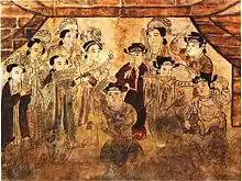 Les représentations musicales à la cour Tang sont de deux types : les représentations assises (坐部伎) et les représentations debout (立部伎)[45]. Les représentations assises sont menées dans des salles plus petites avec un nombre limité de danseurs et mettent l'accent sur un art raffiné. Les représentations debout comportent de nombreux danseurs et sont généralement exécutées dans des cours ou des places destinées à de grandes présentations.