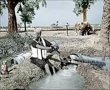 Babylone, est une ville antique de la Mésopotamie située dans l'Irak actuel. On situe le début de sa construction au IIIe millénaire, mais sa profonde transformation et son apogée datent du Ve siècle av. J.-C., avec le roi conquérant Nabuchodonosor II et la construction de palais, temples, ziggourats et des grandes voies de circulation. Babylone, ville plusieurs fois détruite et reconstruite au cours des âges, est l'objet de fouilles depuis une centaine d'années par plusieurs équipes internationales dont des allemandes[48]. La ville était construite sur la partie gauche de l'ancien lit de l'Euphrate, des fossés et canaux remplis par l'eau du fleuve constituaient à la fois un rideau défensif, mais également permettaient le drainage des eaux de pluie et l'évacuation des eaux usées vers le fleuve[49]. Des réseaux d'adduction d'eau de la ville il subsiste peu d'informations, soit par la destruction du site au cours des différentes invasions, anciennes ou plus récentes, soit également par les recherches archéologiques non terminées ou pas encore entreprises.