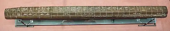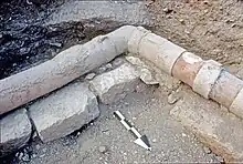 « Suivant le morceau de tube de 0,85 m de long trouvé...la jonction latérale était placée en dessus, ce qui permettait une étanchéité jusqu'au remplissage maximum du tube. La pente de la canalisation était faible mais régulière, environ 1,5 %, qui correspond approximativement à une pente de 1 pouce pour une aune égyptienne...» [20]. Par rapport au système métrique, 1 doigt = 1,89 cm et 1 aune égyptienne = 5 m environ[21]. »