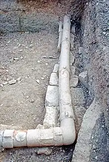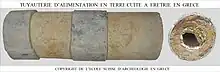 Les tuyauteries les plus utilisées par la civilisation Minoenne, pour le transport des eaux dites sous pression, furent les tuyauteries en terre cuite, réalisées avec des éléments tronconiques de soixante-dix centimètres environ de longueur et d'une section intérieure moyenne de treize centimètres. La finition des emboîtures était d'une grande précision eu égard aux deux parties tronconique ; le joint d'étanchéité était réalisé au moyen d'un ciment spécial, probablement à base de chaux et de poudre de terre cuite « ...for the clay cement of the joints was not broken[65] ». Ce type de tuyauterie de forme tronconique, n'avait encore jamais été utilisé par aucune autre civilisation et ne sera plus jamais utilisé pour d'autres réseaux de tuyauteries, généralement de forme cylindrique. Les tuyaux coniques en poterie son unique dans la Crète minoenne et utilisés pour les réseaux d'alimentation d'eau en faible pression. L'archéologue anglais Arthur John Evans, précise en 1913 : « La magnifique construction des tubes en terre cuite pour l'eau (terra-cotta) [...] Ceux avec leurs poignées et collerettes sont d'une admirable construction et la forme conique de chaque section, donne à l'eau un mouvement d'accélération bien adapté pour prévenir l'accumulation de sédiment[66]. »