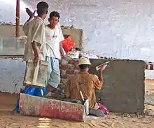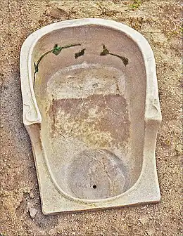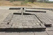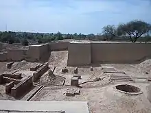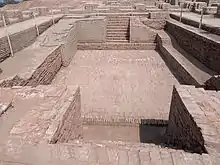 La cité d'Harappa fut construite avant Mohenjo-Daro, mais sur le même modèle d’urbanisation : une cité quadrillée par des rues principales et secondaires, qui aurait compté jusqu'à 40 000 habitants[41]. Les maisons de la Citadelle ou ville haute, habitée par la bourgeoisie dirigeante et de marchands, comportaient un niveau de confort et d'hygiène avancé, avec salles de bains pavées de briques cuites au feu et parfaitement ajustées, ainsi que des latrines au sol lui aussi étanché. Les latrines comportaient un élément fait d'une jarre sans fond qui servait de receveur et se raccordait avec une tuyauterie en poterie sur le réseau horizontal de la maison, lui-même raccordé sur le réseau sur la rue[42]. Le long des rues principales étaient construits des réseaux d'évacuation des eaux usées en pierre, avec regards de visite et raccordement de chaque maison en tuyaux de poterie, sur le même modèle que les réseaux de Mohenjo-Daro.