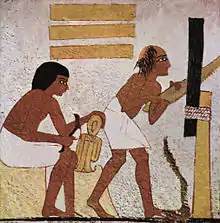 La fabrication et la mise en forme des tuyaux, ainsi que la fixation longitudinale, de même que la pose d'un réseau de plusieurs centaines de mètres, ne peuvent être que l’œuvre d’ouvriers hautement qualifiés, qui ne s'appelaient pas encore plombier, mais en avaient l’expérience et la qualification. Une fresque, dans une des tombes, montre la fabrication d’une feuille de cuivre avant son utilisation, depuis la fonte du minerai et le coulage sur lit de sable, jusqu’à son amincissement par martelage puis sa découpe en feuille[23].