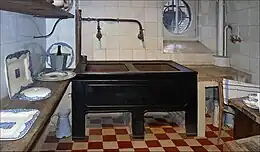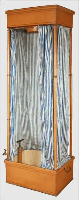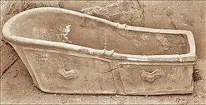 Les recherches archéologiques ont montré l'importance de l'eau dans l'hygiène et les plaisirs de la civilisation minoenne. En plus des fontaines et des thermes publics, les appartements des palais étaient équipés de salles de bains[70], avec l'eau courante et des toilettes alimentées en eau. Dans le Domestic quarter du Palais de Cnossos, plusieurs latrines, en rez de chaussée et au premier étage, étaient alimentées en eau à partir de réservoir en étage ou en terrasse et comportaient une tuyauterie d'évacuation ventilée et raccordée au réseau principal[71]. Les lavabos retrouvés par les archéologues, étaient des vasques de pierre à fond plat et poignées pour être transportées. Ces vasques, finement décorées, s'apparentent aux larnax de petites dimensions, utilisés à la fois de baignoire et de cercueil[72]. Dans certaines maisons privées, ont été découvertes dans l'île de Santorin, encore utilisées lors de l'irruption du volcan Théra, des salles de bains où étaient installées des baignoires[73].
