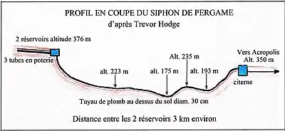 Concernant les tuyauteries retrouvées dans le caravansérail au sud du palais de Cnossos, il est suggéré par Andreas N. Angelakis, reprenant les textes de Sir Arthur John Evans que : « L'alimentation de ce bâtiment se faisait depuis une source sur la colline de Gypsades et que l'eau devait d'abord descendre de cette colline, puis remonter pour l'alimentation du caravansérail, suivant le principe des vases communicants. Les artisans – plombiers – minoens avaient la connaissance des vases communicants et du principe du siphon[64]. » Ce système hydraulique sera utilisé par les plombiers romains un millénaire plus tard, pour l'alimentation de la ville de Pergame, actuellement en Turquie, au IIe siècle av. J.-C. et pour l'alimentation de la ville de Lugdunum (Lyon) au IIe siècle av. J.-C., avec notamment les siphons de l'aqueduc du Gier.