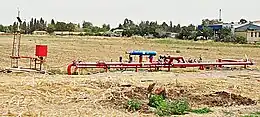 Dans plusieurs locaux du temple mortuaire dit en amont, proche de la pyramide principale, ainsi que dans celui dit en aval, pour la purification au bout de la galerie, un réseau de tuyauteries d'évacuation en cuivre, d’un diamètre de 47 mm, de 1,4 mm d'épaisseur et de plusieurs dizaines de mètres de long, datant de -2500, a été mis à jour. Ce réseau de tuyauteries servait à l'évacuation de l'eau, de l'huile et des graisses de plusieurs bassins utilisés pour la préparation des corps des défunts lors de l'embaument ainsi qu'au nettoyage des outils. La pente des tuyauteries était d'environ 1,5 %[16]. Un élément de la tuyauterie est exposé au sein de la collection du Ägyptisches Museum à Berlin. La tuyauterie de cuivre était engravée dans un caniveau de pierre et pour sa protection, posée et recouverte par un lit de mortier, des dalles de pierre recouvraient l'ensemble[N 8].