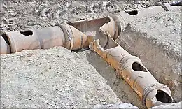 Le cuivre, un des plus anciens métaux utilisés par l’homme, aurait été découvert sur les plateaux d'une des premières civilisations du monde et avant que le pays ne s'appelle la Perse puis l’Iran. Le début de son utilisation remonterait au VIe millénaire[26]. Lors des fouilles effectuées sur le site de la ville de Dur-Untash (ou complexe de Chogha Zanbil), dans la province du Khouzistan iranien, il a été mis au jour plusieurs réseaux d'eau, en pierre et en poterie[27]. Certaines des jonctions de ces tuyaux en poterie étaient particulières, elles étaient réalisées au plomb fondu. Cette technique du joint au plomb fondu sur des tuyaux en poterie, sera utilisée près d'un millénaire plus tard, au VIe siècle av. J.-C., lors de la construction de la canalisation d'amenée d'eau, dite de l'aqueduc Persistratis, pour l'alimentation de la ville d'Athènes. À Dur-Untash, d'autres poteries souterraines pour l'évacuation des eaux de pluie des maisons, étaient en poterie recouverte de goudron naturel (naphte) pour en réaliser l'étanchéité[28].