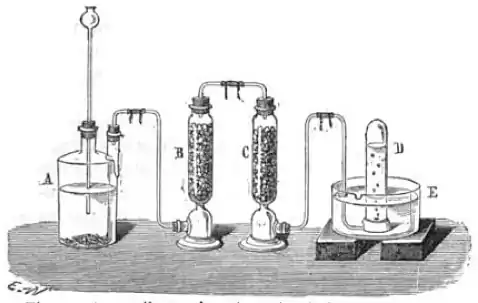 L’hydrogène est préparé en laboratoire par action des acides sur les métaux : l’acide sulfurique dilué contenant un volume d’acide concentré pour cinq volumes d’eau, ou l’acide chlorhydrique dilué contenant un volume d’acide concentré pour quatre volumes d’eau, est ajouté au zinc granulé. Du sulfate de zinc ou du chlorure de zinc sont formés, de l’hydrogène est libéré[25].