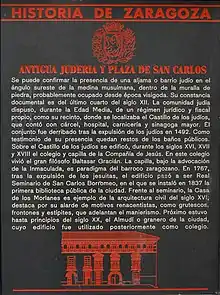 De la communauté juive de Saragosse, il ne reste que les bains rituels du XIIIe siècle trouvés dans le sous-sol d'un immeuble moderne dans la rue Coso (no 126-132), composés de nombreux arcades soutenues par des colonnes, utilisés comme synagogue, hôpital, boucherie et prison dont le terrain est occupé maintenant par le Séminaire de San Carlos. Il s'étend sur les actuelles rues Don Jaime, Veronica, place San Pedro Nolasco, rue Santo Dominguito, place San Carlos et rue de San Jorge[34].