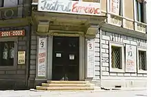 Entrée de l'ancienne maison C. Corjescu, en ruines à Iaşi. Construite en 1915, devenue hôpital israélite (inscription en pignon : « Hôpital pour enfants - Polyclinique Dr L. Ghelerter ») et souvent confondu avec la synagogue principale de Iaşi (ro).
