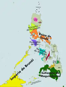 Fernand de Magellan est le premier Européen à visiter l’archipel quand il débarque sur l’île de Homonhon, au sud-est de Samar, le . Avant l’arrivée de Magellan, plusieurs royaumes et sultanats existaient aux Philippines, tels que le royaume bouddhiste de Butuan, les royaumes de Tondo et Maysapan, florissants depuis le Xe siècle, ou les sultanats musulmans de Sulu, Maynila, Maguindanao et Lanao. Ces divers royaumes atteignent une organisation politique et sociale complexe, et commercent avec la Chine, l’Inde, le Japon, la Thaïlande, le Viêt Nam et Java, mais aucun n’arrive à étendre son influence sur l’ensemble de l’archipel actuel des Philippines. Par ailleurs, des populations Barangays demeurent indépendantes dans l’archipel, et sont parfois alliées avec un ou plusieurs des grands royaumes avoisinants.